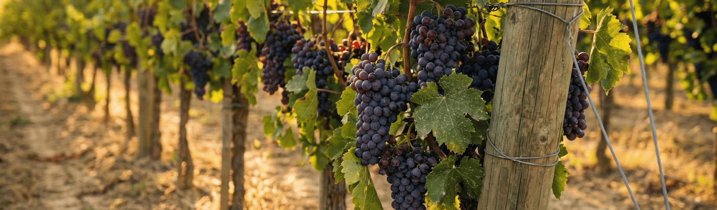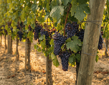 Vineyards stretch in gentle rows, their leaves catching the amber glow of late afternoon sun.